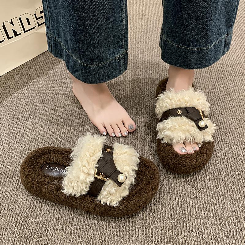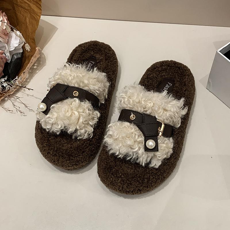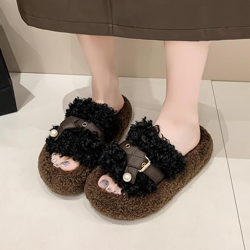 Ретро плюшевый дизайн пушистые тапочки женская уличная обувь 2025 новый осень и зима толстая подошва увеличивающая рост ремешок с пряжкой хлопковые тапочки