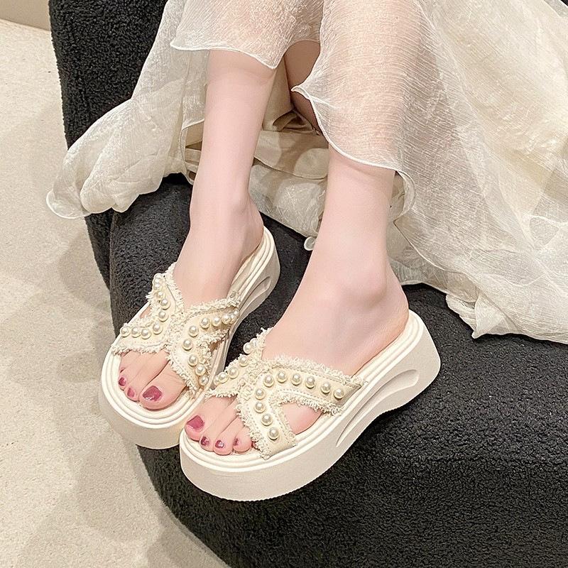 Жемчужные тапочки женские 2025 весна и лето новинка плоская подошва модные корейская версия универсальные сандалии-слайды интернет-знаменитости