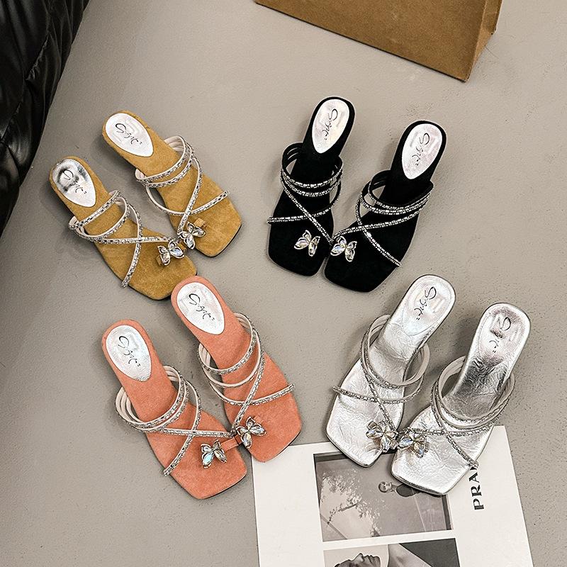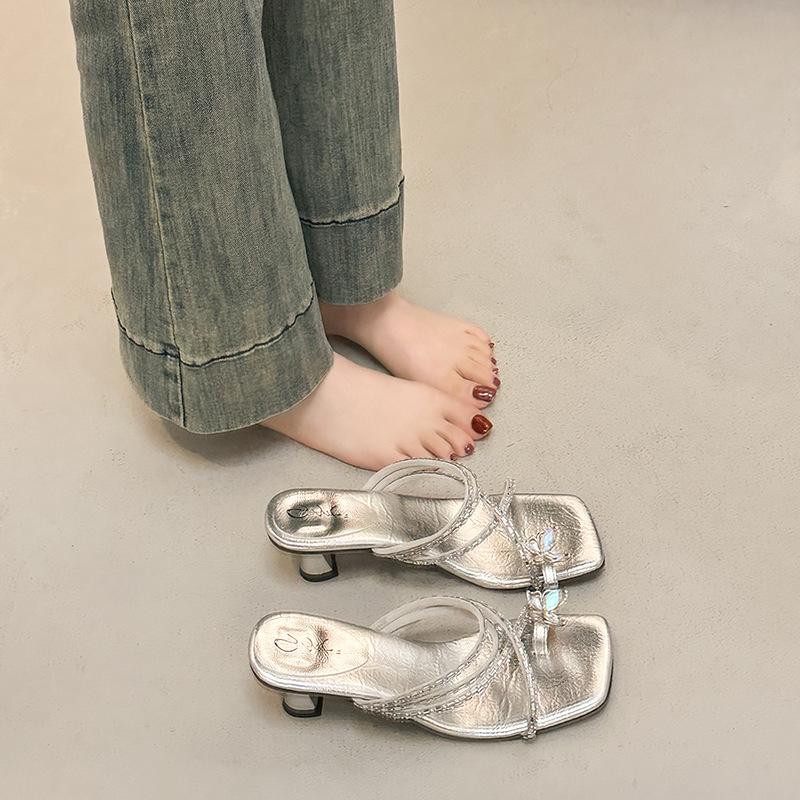 Нишевые крутые шлепанцы на высоком каблуке со стразами, женская обувь на толстом каблуке, новые летние шлепанцы 2025 года с темпераментом для ношения с юбкой
