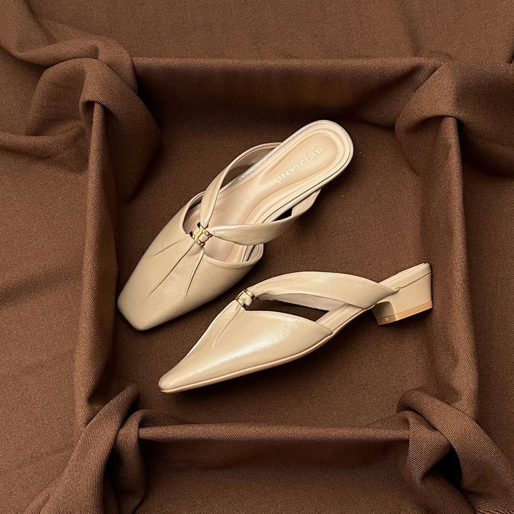 Square head half-drag Muller shoes low heels 2025 summer new square head absolute child beige wear cool slippers women