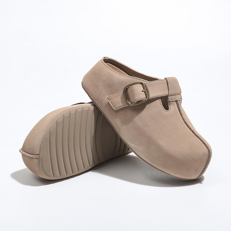 Модные женские шлепанцы на плоской подошве с внутренней платформой, осенняя новинка, с круглым носком, средней пряжкой, из замши, на одной подошве, на мягкой подошве, нескользящие, полушлепанцы