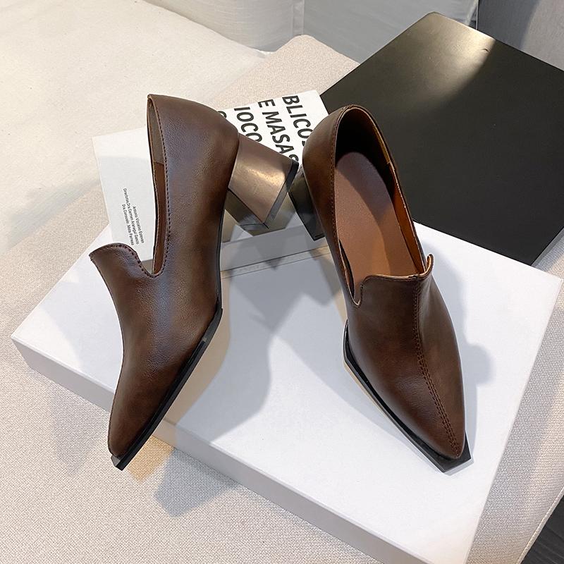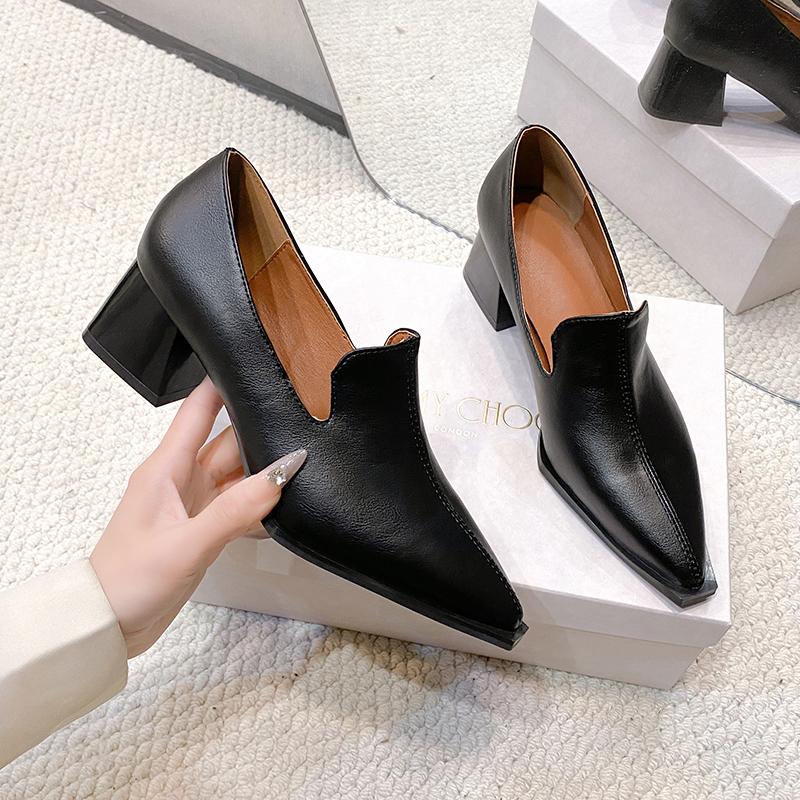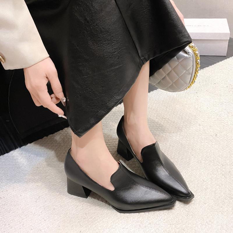 Модная весенняя новая одинарная обувь женская модная остроносая со средней высотой подъема слипоны противоскользящая и износостойкая темперамент квадратный каблук