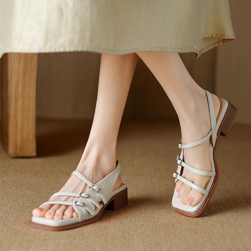 Омолаживающие ретро квадратный носок толстый каблук многословная пряжка с открытым носком, весна и лето 2025 новые римские сандалии женская обувь