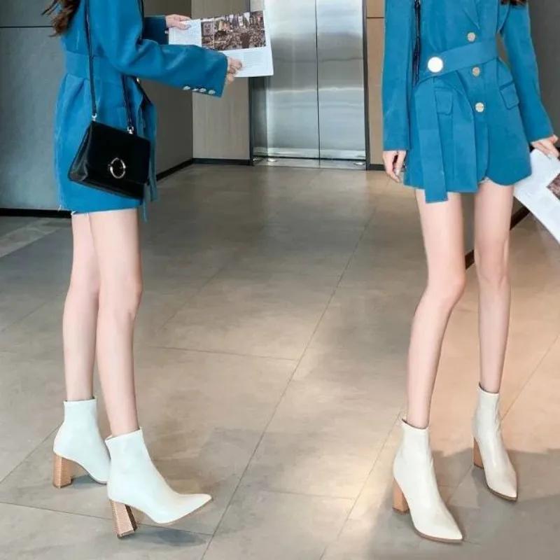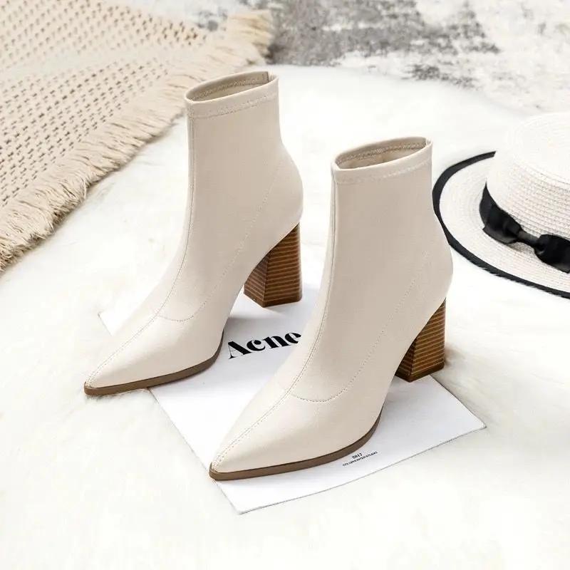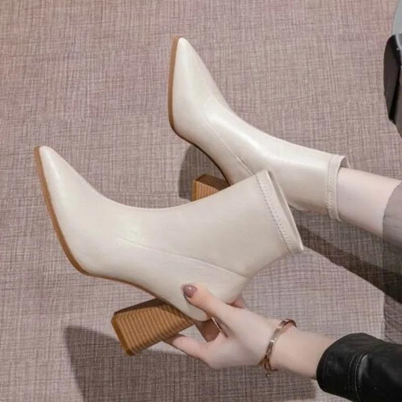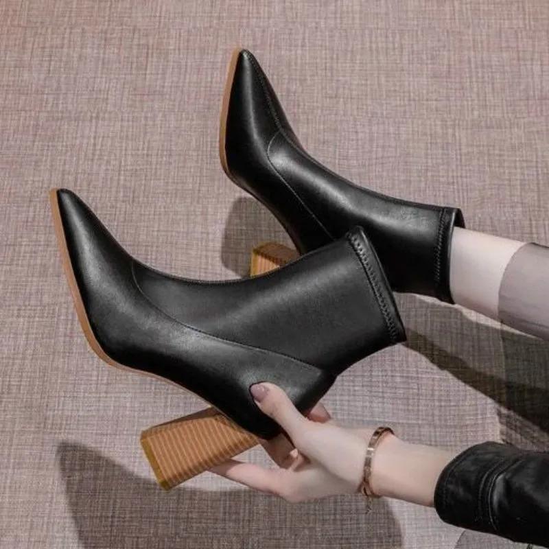 Модные ботильоны для женщин на толстом каблуке, весенне-осенние одинарные ботинки, новые остроносые туфли на высоком каблуке 7 см, нюдовые туфли на среднем каблуке, черные ботильоны для женщин