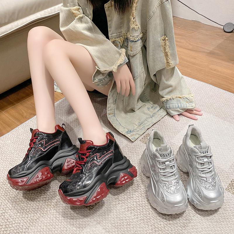 Мода НОВЫЕ Женские Повседневные Кроссовки на Платформе 10СМ Высокий Каблук 2025 Зимняя Спортивная Кожаная Обувь Блестящие Кроссовки Массивные Ботинки Zapatillas Mujer