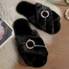 Мода Мода Плюшевые тапочки с перекрестными ремешками Женские Металлический декор Домашние Хлопковые тапочки Женские Зима 2025 Мягкие Противоскользящие Плюшевые шлепанцы Женские
