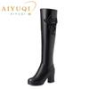 Модные женские ботфорты AIYUQI Зимняя мода Средний каблук Меховые длинные сапоги Женские сапоги для верховой езды из натуральной кожи Женские