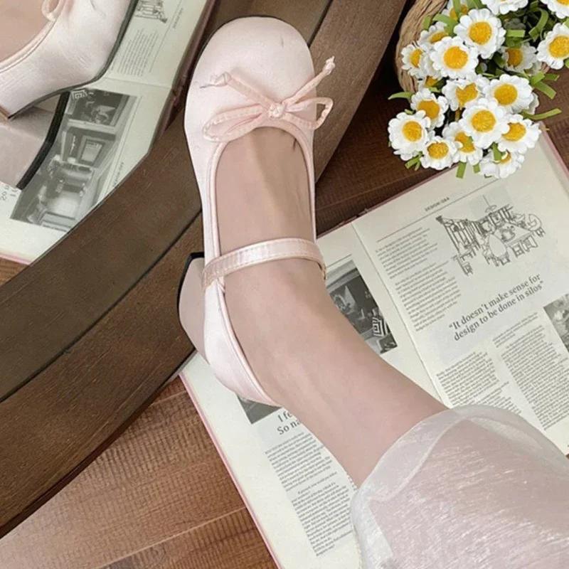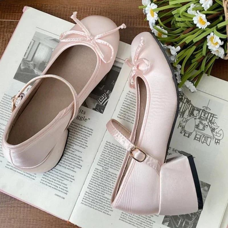 Мода 2025 Весна Женская обувь Милые Сладкие Туфли Мэри Джейн с бантом для женщин Винтажные Шелковые Туфли-лодочки на среднем каблуке Дамские Банкетные Свадебные Одинарные туфли