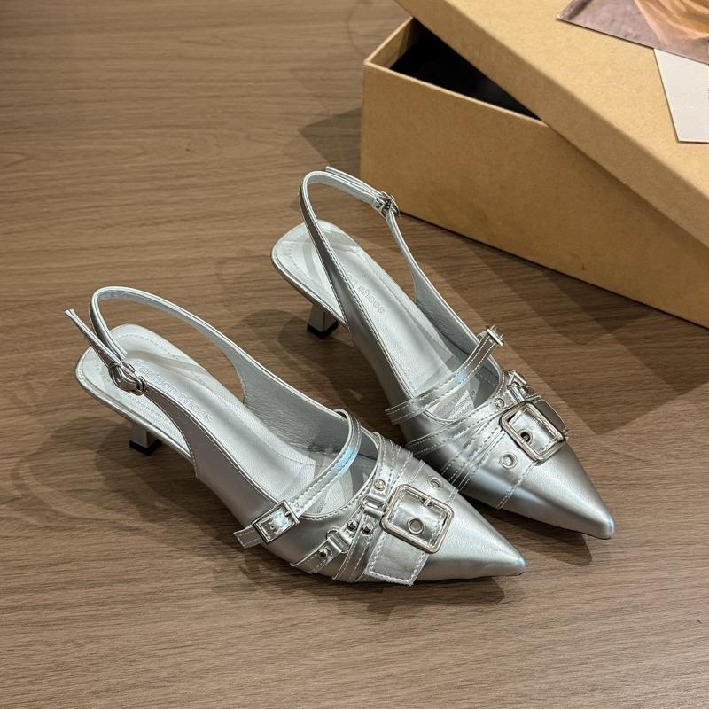 Модные туфли на высоком каблуке с острым носком Весна и лето 2025 Новые Французские Сандалии с ремешком и пряжкой, закрытый носок, с открытой пяткой