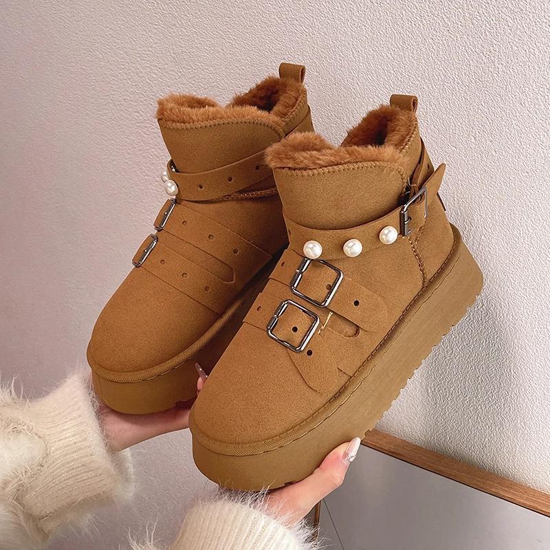 Мода Мода Замшевые Женские Ботильоны Зимние Жемчужный Пояс Пряжка Дизайнерские Короткий Плюш Теплые Тренд 2025 Уютная Женская Обувь Botas Mujer