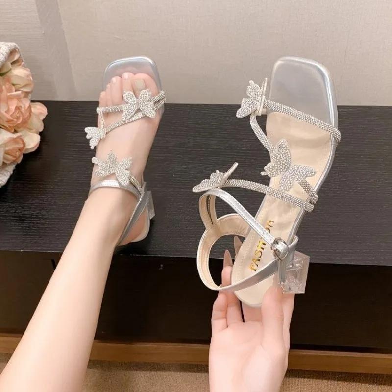 Модные летние новые босоножки с бантом из страз, женские, с квадратным носком, открытым носком, нескользящие, износостойкие, на хрустальных каблуках
