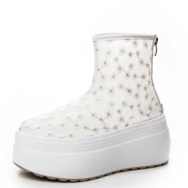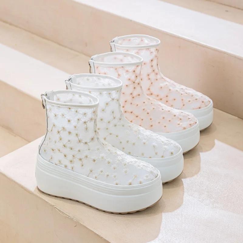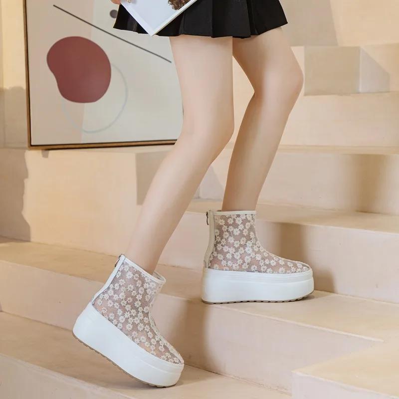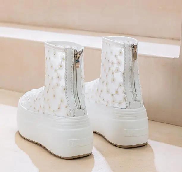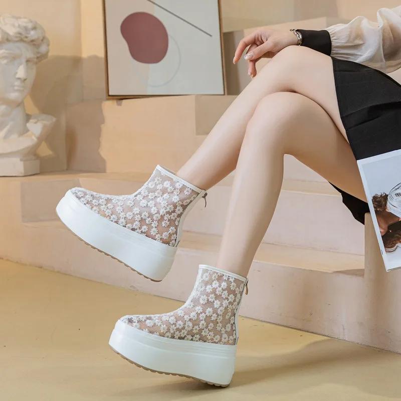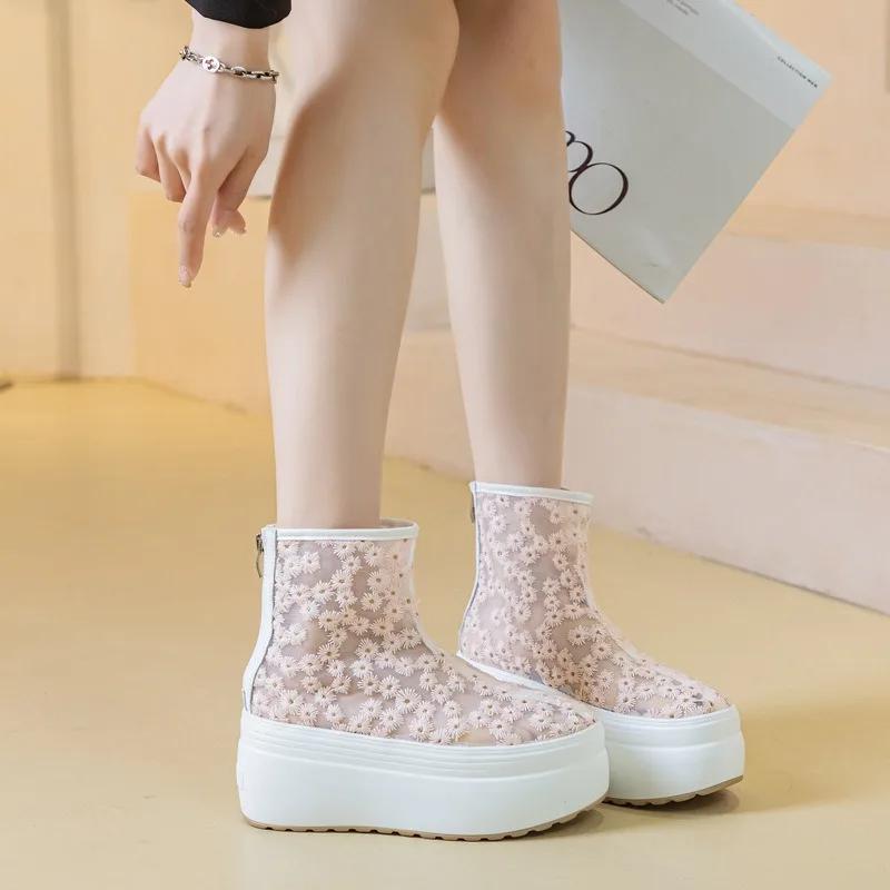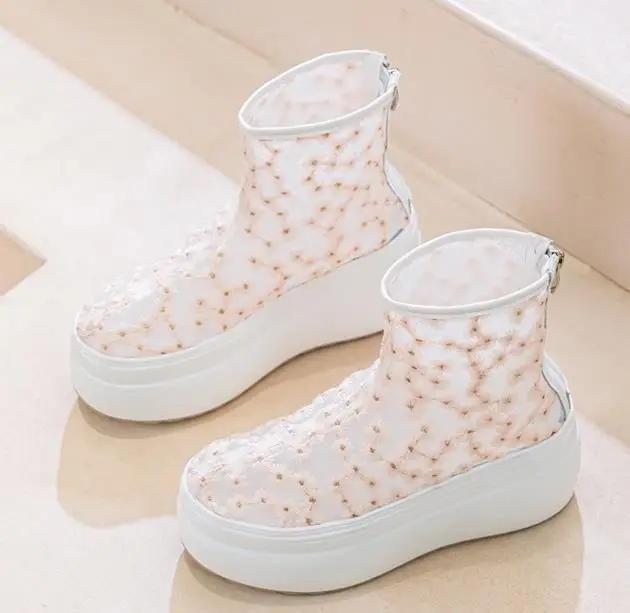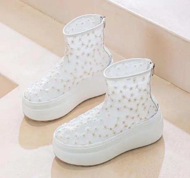 Модные 8 см сетчатые дышащие мотоциклетные ботильоны женские ботинки на молнии женские модные сандалии вышитые цветы летние полые