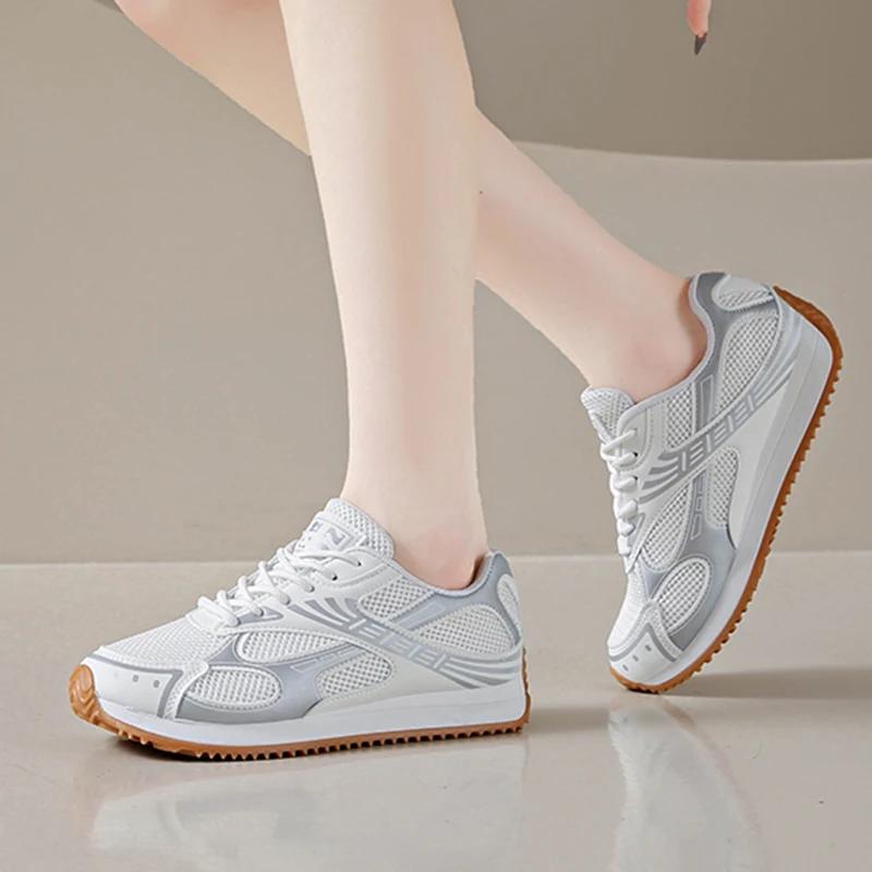 Модные женские кроссовки Модные дышащие сетчатые женские туфли Серебристые кроссовки на толстой подошве Вулканизированная обувь Удобные кроссовки для тенниса на шнуровке