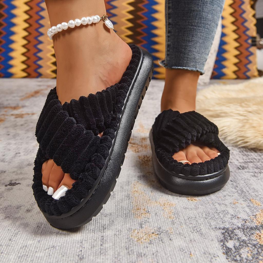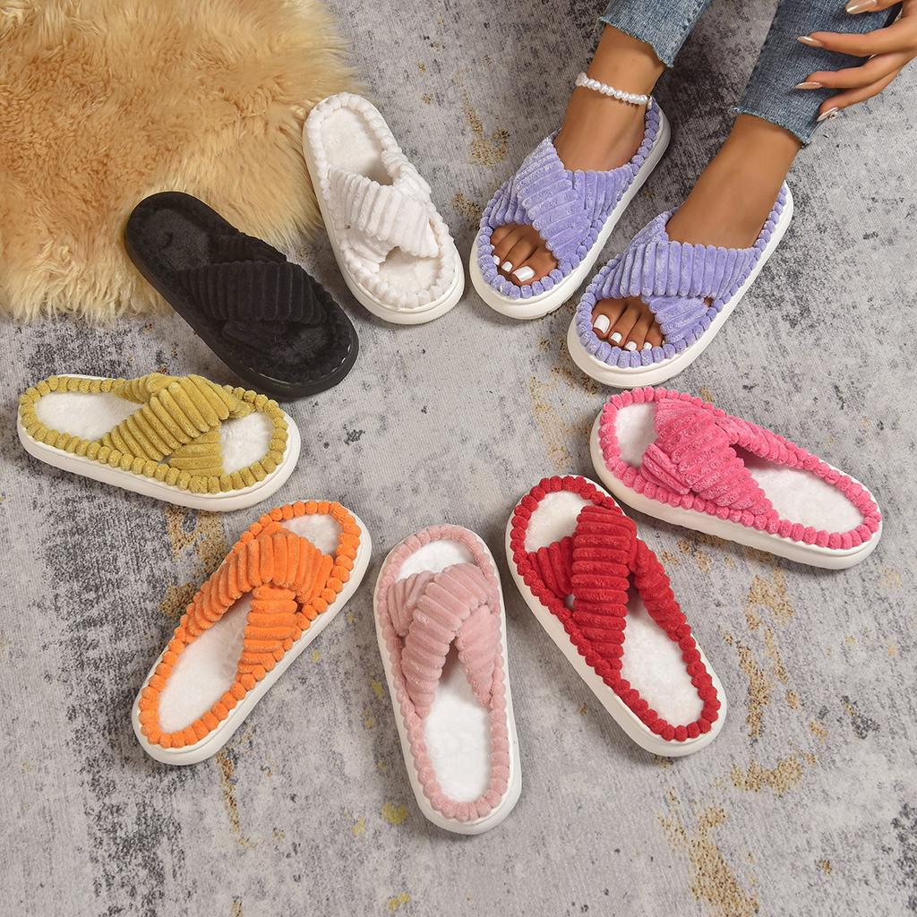 Модные тапочки с перекрестными ремешками Женская мода Новые Женские Мягкие Вельветовые Платформенные Домашние Шлепанцы Мужские Портативные Теплые Плюшевые Сандалии Женская Обувь