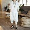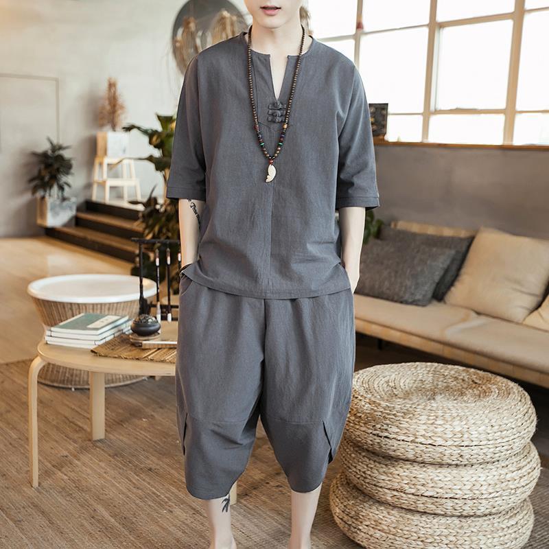 Мужской летний льняной комплект: футболка и брюки длиной семь восьмых в стиле ханфу - Свободный крой, Большой размер — купить товар онлайн с бесплатной доставкой до всему миру!