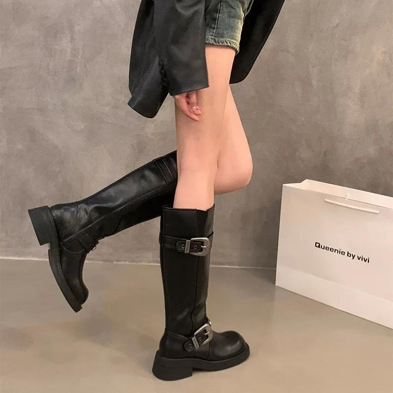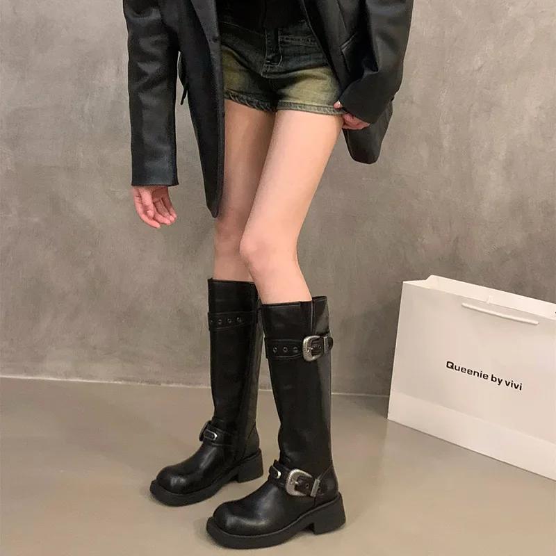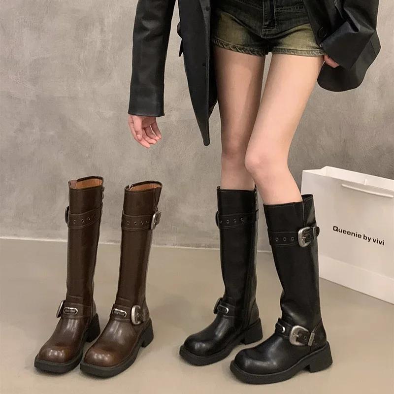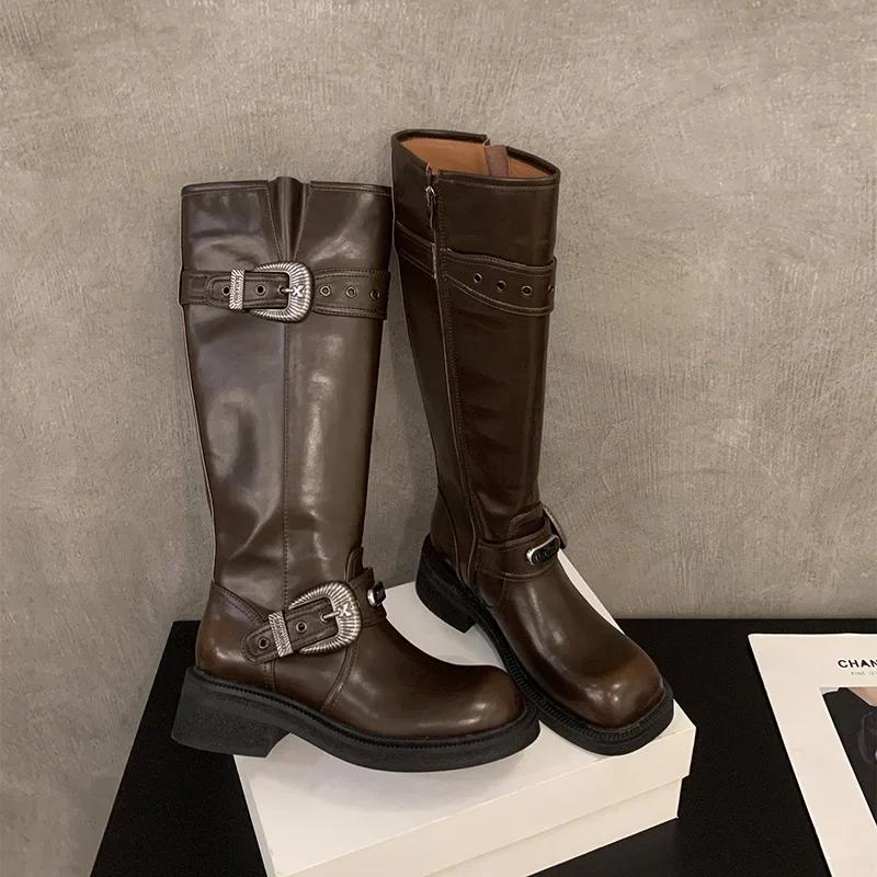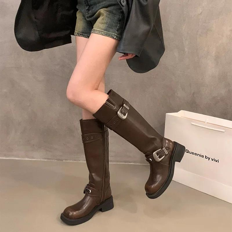 Модные винтажные женские рыцарские длинные сапоги, модные элегантные туфли с пряжкой-ремнем, квадратный каблук, женские ковбойские ботильоны в западном стиле