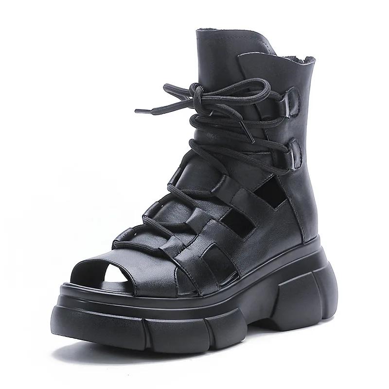 Модные 6,5 см Ретро Сандалии с открытым носком из натуральной кожи Женские Летние на платформе Увеличивающие Роскошные с полым задником Застежка-молния Высокие Повседневные Сандалии Черные