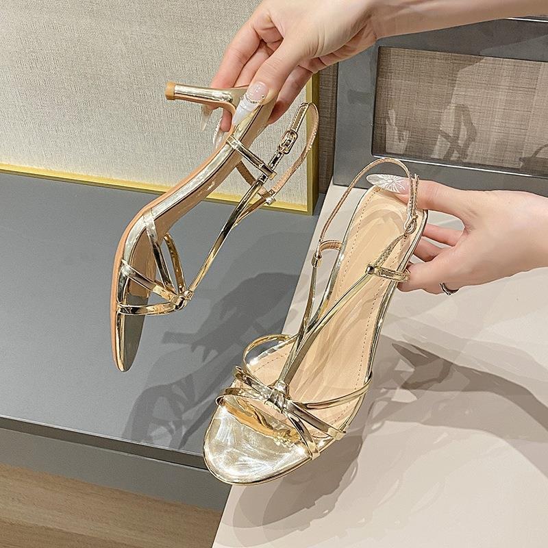 Золотые босоножки на высоком каблуке с ремешком для женщин, новая летняя трансцендентная модель с ремешком на одно слово, шпилька, темперамент, светские дамы, сандалии с открытым носком