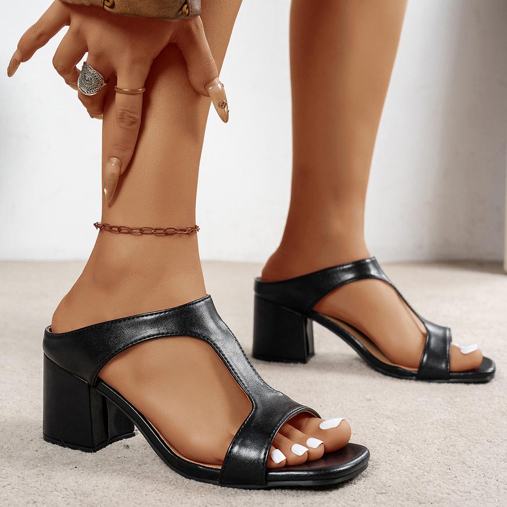 Женские туфли на высоком каблуке 2025 Весна Новые шлепанцы Универсальный однотонный средний каблук Толстый каблук Сандалии с квадратным носком Женские