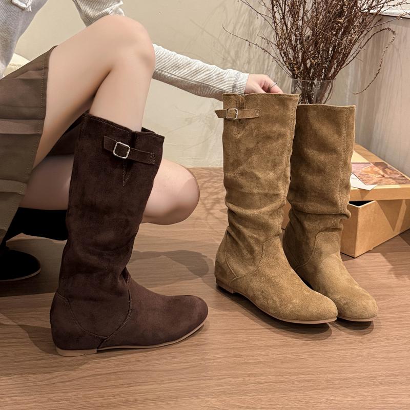2025 Новые женские высокие сапоги до колена на плоской подошве, зимняя повседневная замшевая ретро готическая женская обувь челси с пряжкой, женские ботильоны
