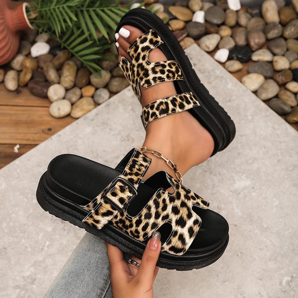 Высококачественные женские тапочки с леопардовым принтом и металлической пряжкой, сексуальные удобные нескользящие сандалии, летние шлепанцы на платформе 43 размера