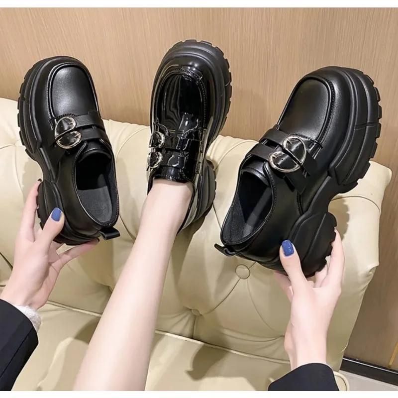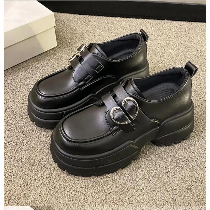 Мода 2024 Осень Лоферы Женские Высокая Платформа 7СМ Обувь Женская Толстая Подошва ПУ Кожа Британская Металлическая Пряжка Простые Туфли Мэри Джейн