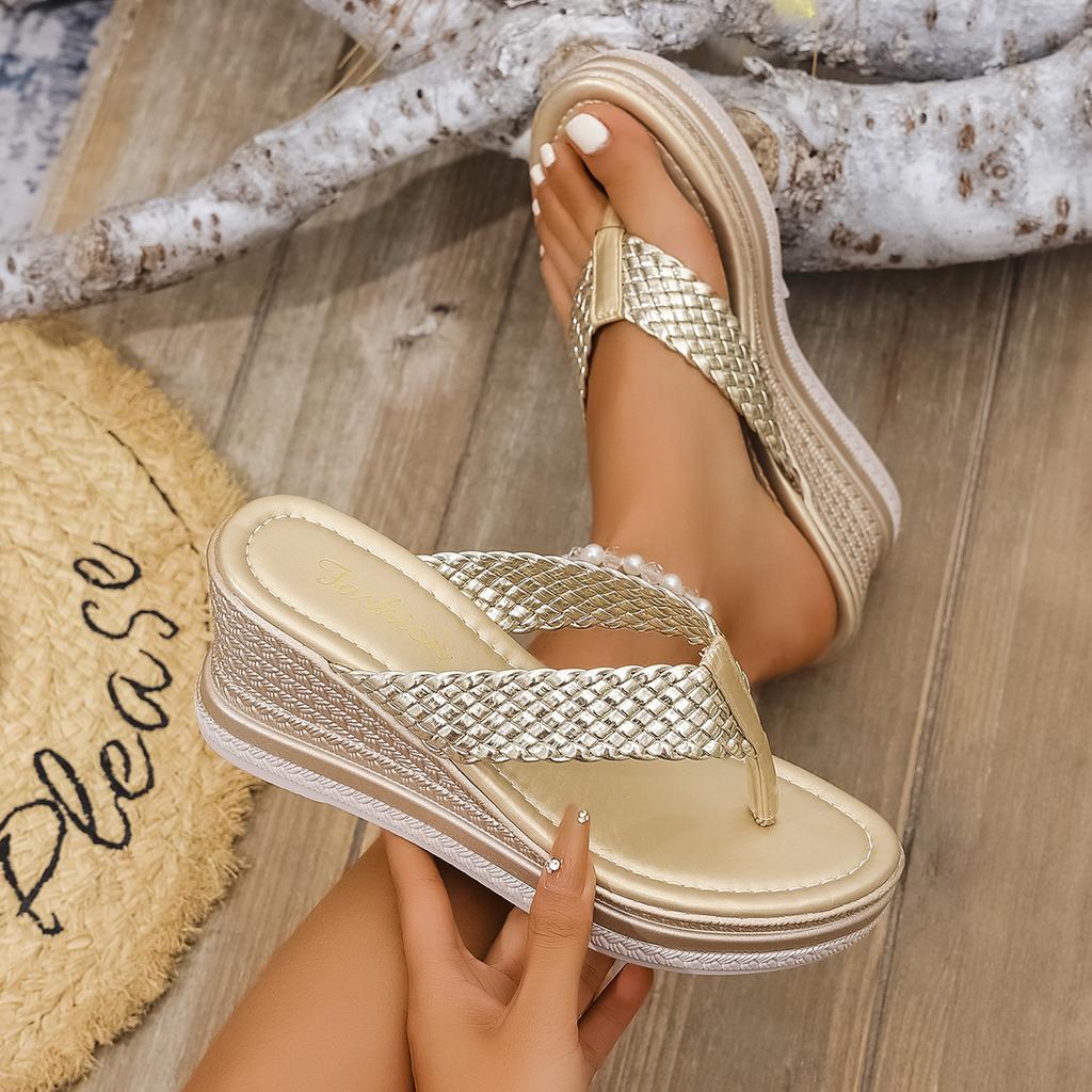 Мода 2025 Новые женские сандалии на танкетке Модные плетеные шлепанцы Толстая подошва Пляжные сандалии Легкие Удобные Туфли с перемычкой для пальцев Женские