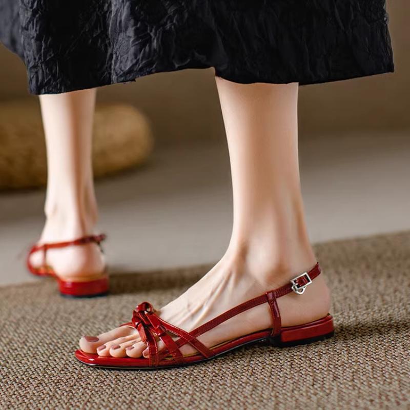 Мода 2025 Лето Повседневные Балетки Сандалии Ретро Простые С Открытым Носком Красная Кожа Плетеный Ремешок Сандалии Женская Вечерняя Обувь Sandalias De Mujer