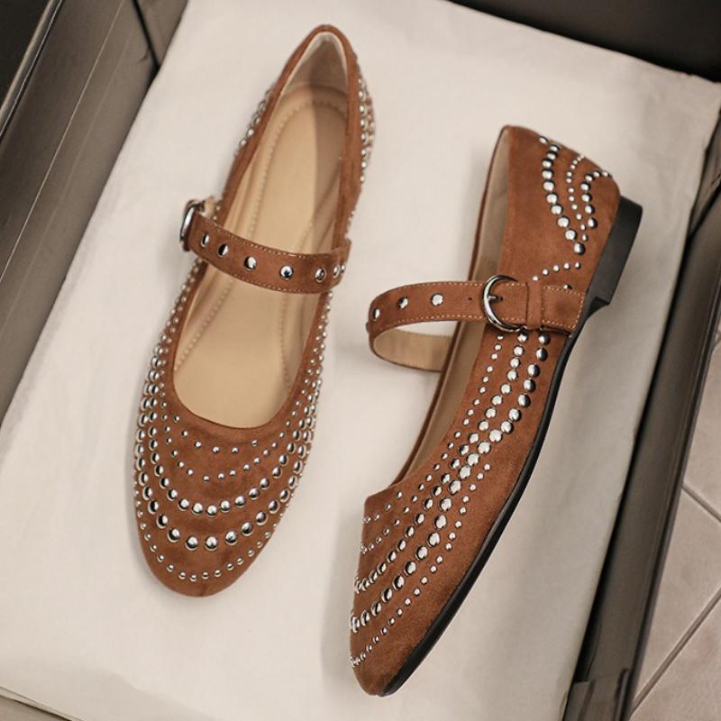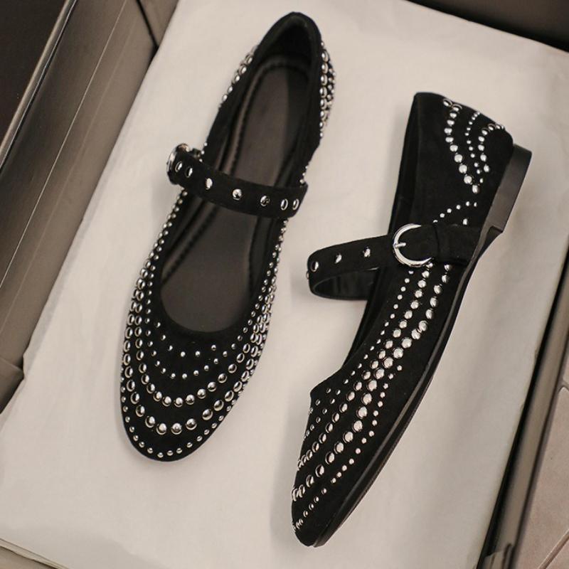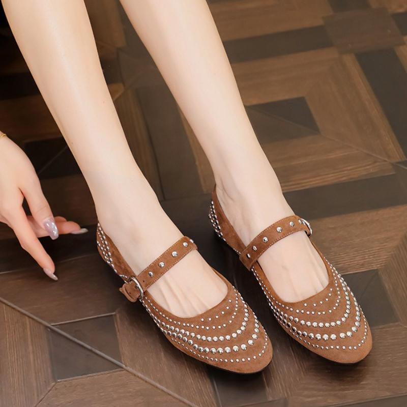 Модные туфли Мэри Джейн в стиле ретро с заклепками, женские туфли на ремешке с пряжкой, с мелким круглым носком, женские модные элегантные замшевые туфли для платья