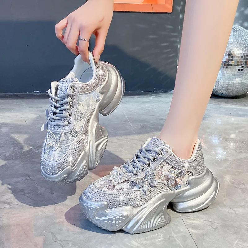 Модные кроссовки на толстой подошве с бриллиантами, женские, новинка весны и осени 2024 года, мягкая подошва, дышащая сетка, модная повседневная спортивная обувь, тренд