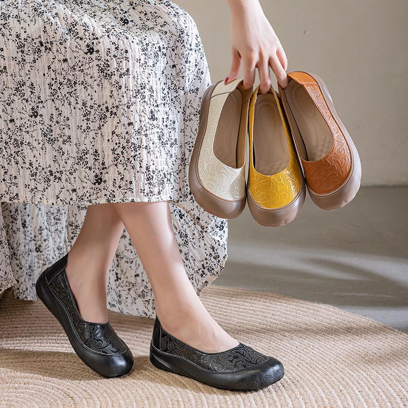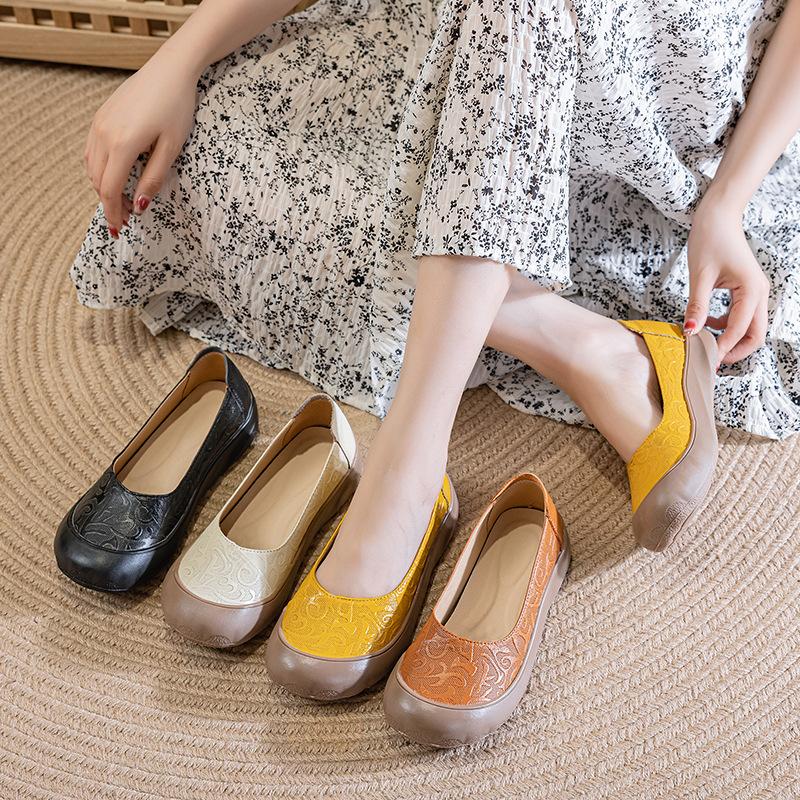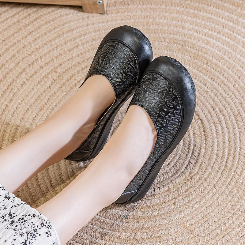 New pedal breathable full leather hollow mother leather non-slip soft sole comfortable flat single shoes women's shoes