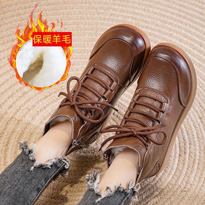 Зимние новые кожаные шерстяные ботинки Мартин повседневные универсальные утолщенные бархатные нескользящие на плоской подошве хлопковые туфли женские короткие ботинки