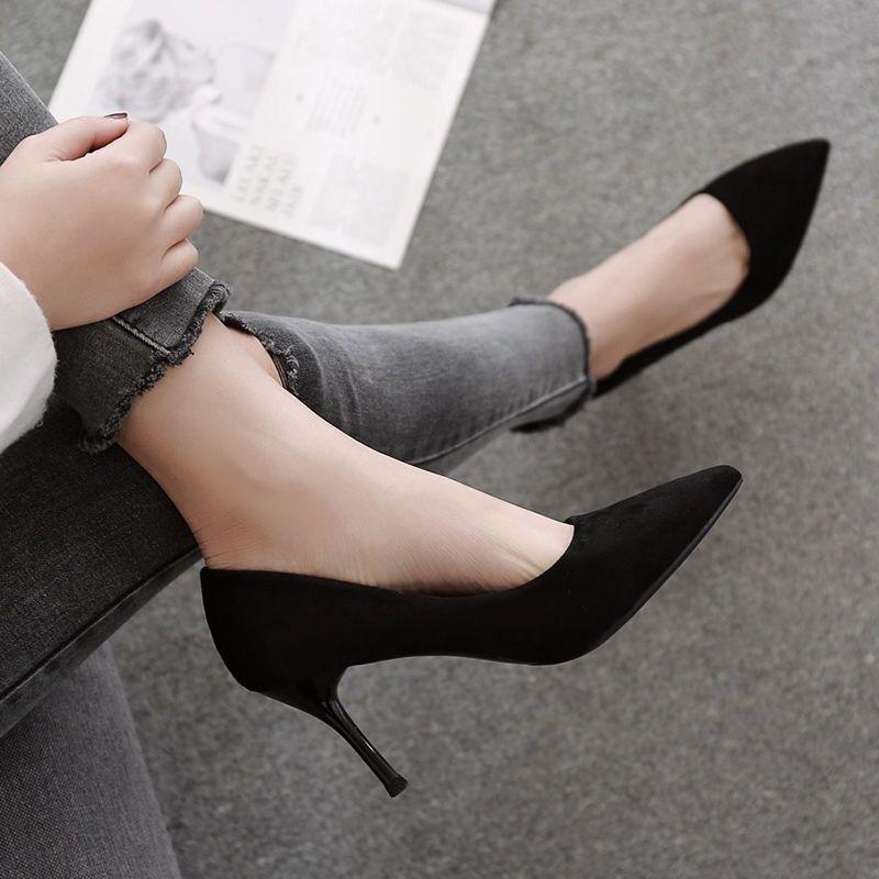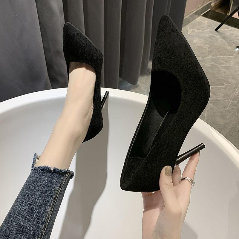 Женские туфли на высоком каблуке весна и осень новые черные тонкие каблуки острый носок с открытой союзкой замшевые профессиональные туфли большого размера туфли для этикета