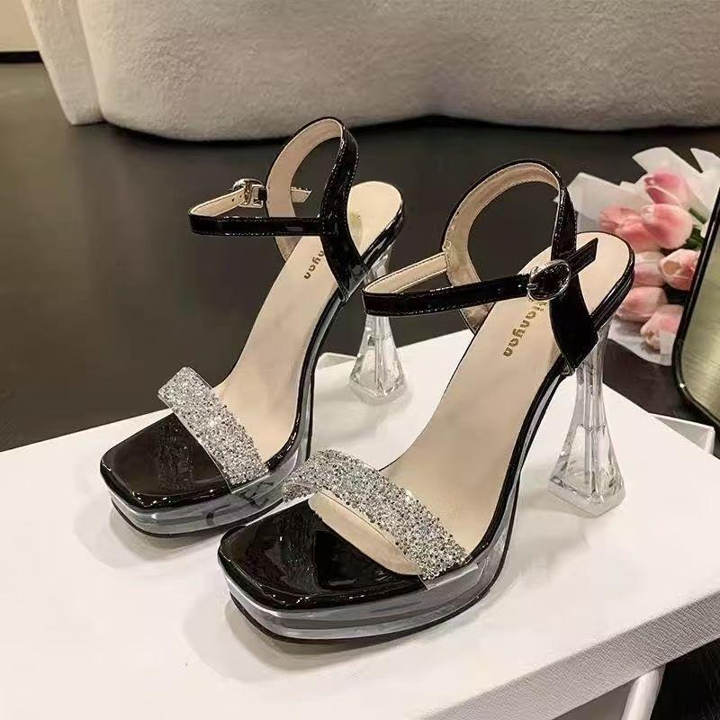 Прозрачный кристальный каблук босоножки на высоком каблуке женские летние новые туфли на толстом каблуке со стразами и водонепроницаемой платформой