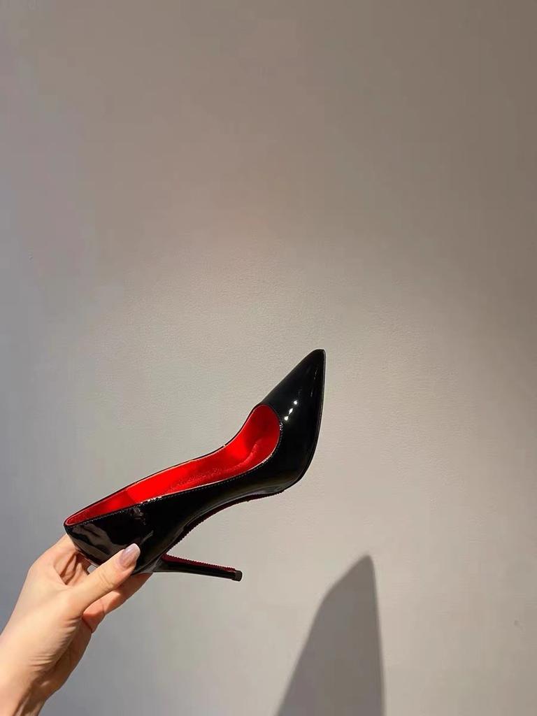 Черные туфли на высоком каблуке с красной подошвой для женской весны, новые, с острым носком, на тонком каблуке, сексуальные, с глянцевым темпераментом, одинарные туфли, женские туфли из лакированной кожи