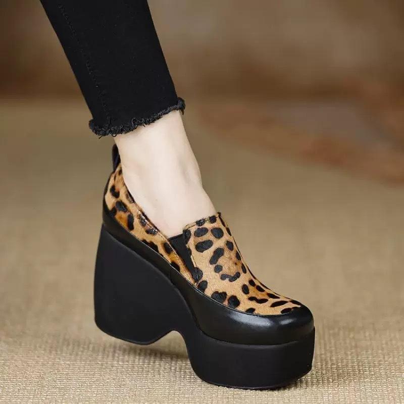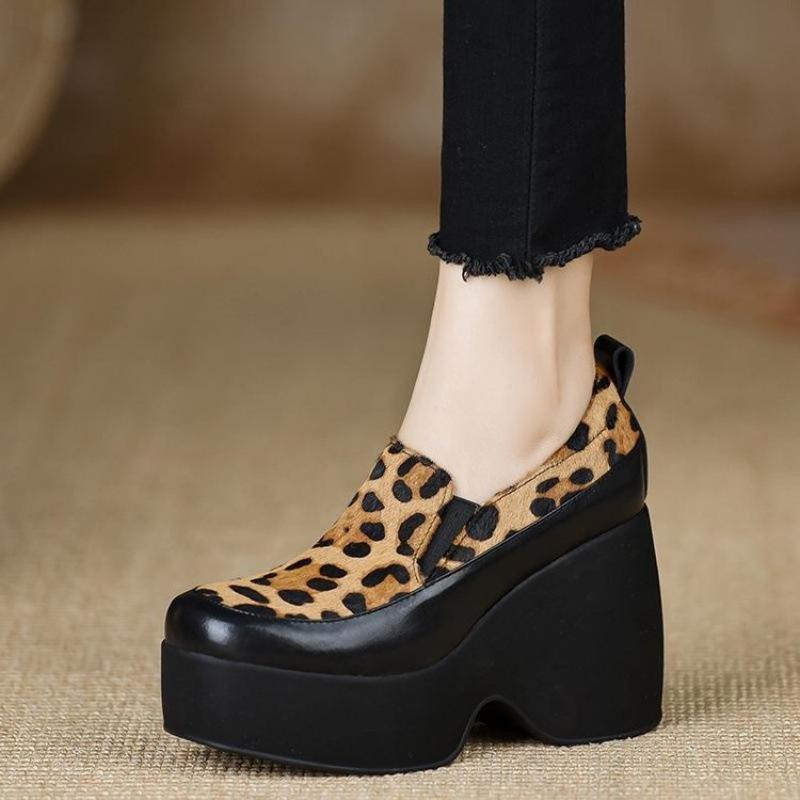 Женская обувь ручной работы Маленькие кожаные туфли-лодочки Удобные водонепроницаемые столик Высокий каблук танкетка маффин