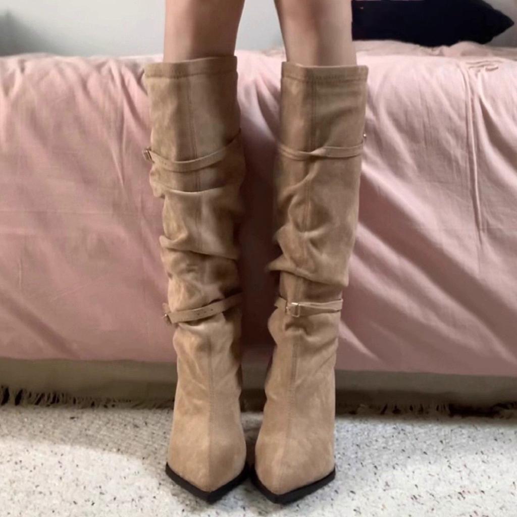 Французская мода острые замшевые сапоги женские осень и зима новые плиссированные сапоги-чулки с пряжкой на ремне сапоги на высоком каблуке
