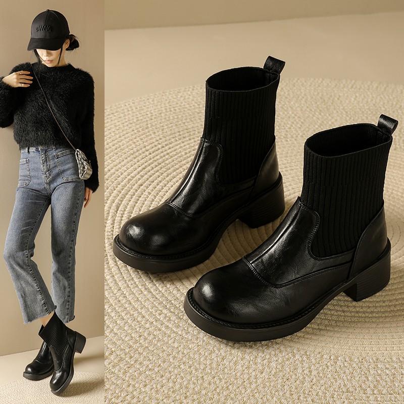 Новые теплые короткие ботинки женские в британском стиле осенне-зимние тонкие ботинки на толстой подошве ботинки Мартин женские эластичные вязаные ботинки