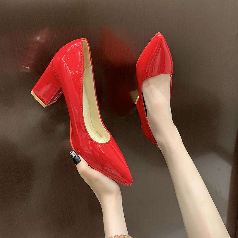 Квадратный носок, одинарная обувь, женская, знаменитость, лакированная кожа, высокие каблуки, толстый каблук, педикюр, мелкий вырез, закрывающая стопу, профессиональная обувь, женская обувь