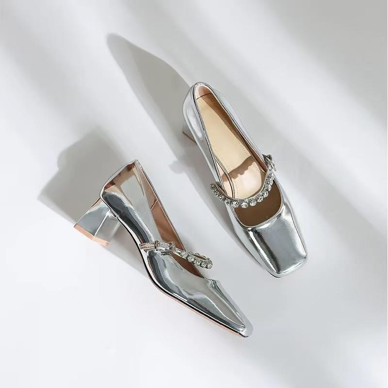 Серебристые ретро лакированные туфли Мэри Джейн женские туфли на толстом каблуке одинарные туфли новый французский темперамент ремешок с бриллиантом в одну линию Гао Цуйвэй