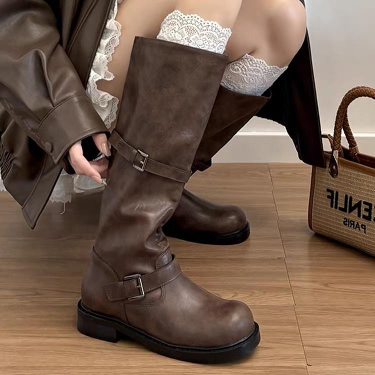 Кожаные толстоподошвенные с круглым носком ретро с пряжкой на ремне потертые длинные сапоги женские осенне-зимние средней высоты сапоги сапоги-рыцари