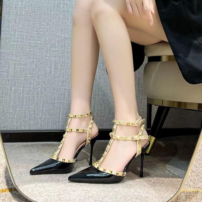Новые европейские и американские сексуальные туфли-лодочки на тонком каблуке с заклепками, женские сандалии с острым носком и ремешком на щиколотке, женские свадебные туфли на среднем каблуке, туфли-лодочки