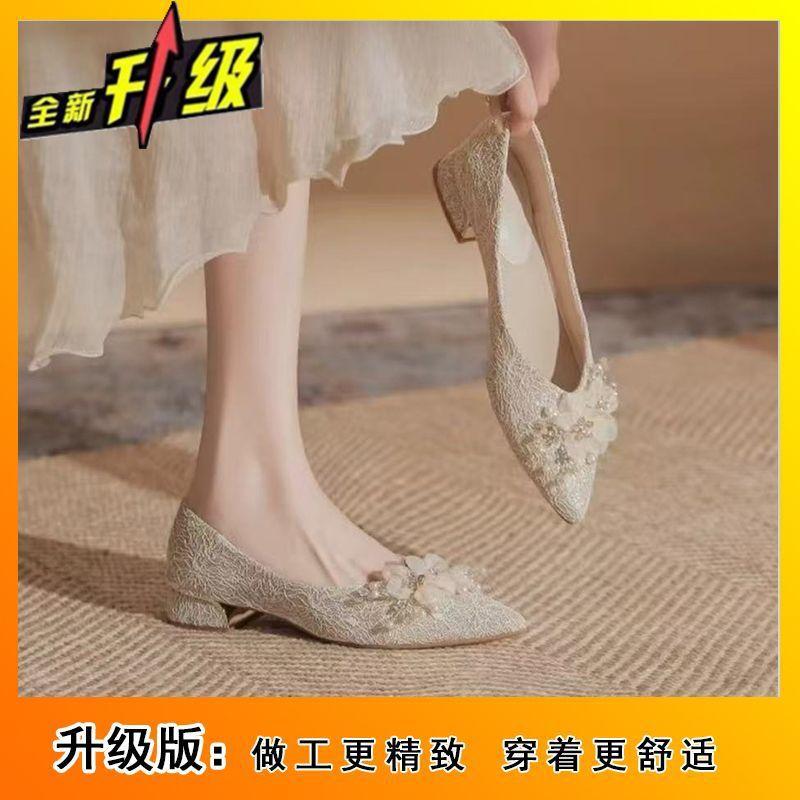 Красивые свадебные туфли с цветами, женские весенне-летние туфли на низком каблуке, с двумя острыми толстыми каблуками, туфли-лодочки с мелким вырезом, на плоской подошве, не утомляют ноги