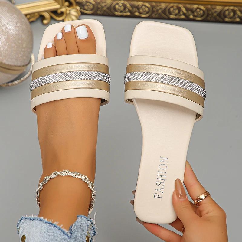 Мода Мода Новые Шлепанцы на Низком Каблуке из ПУ Кожи Женские Дизайн с Пайетками Квадратный Носок Летние Женские Шлепанцы Легкие Сандалии Mujer