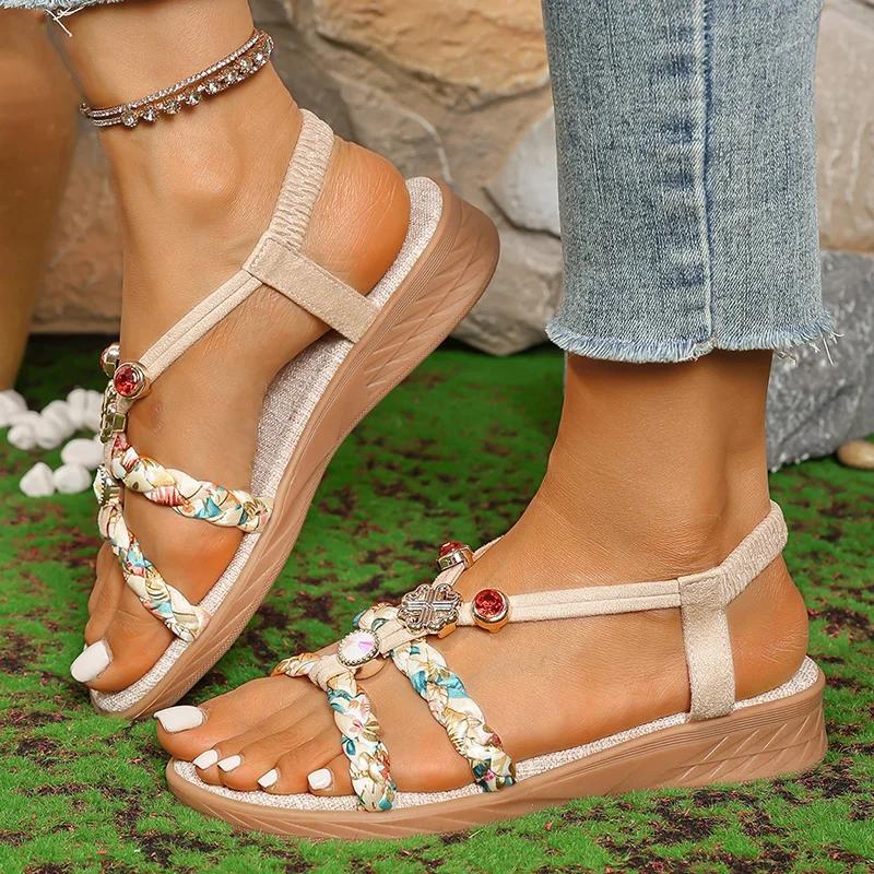 Модные плетеные сандалии-балетки в богемном стиле, женские летние больших размеров 36-43, нескользящие пляжные сандалии, женские с открытым носком, на мягкой подошве, римские туфли — купить товар онлайн с бесплатной доставкой по всему миру!