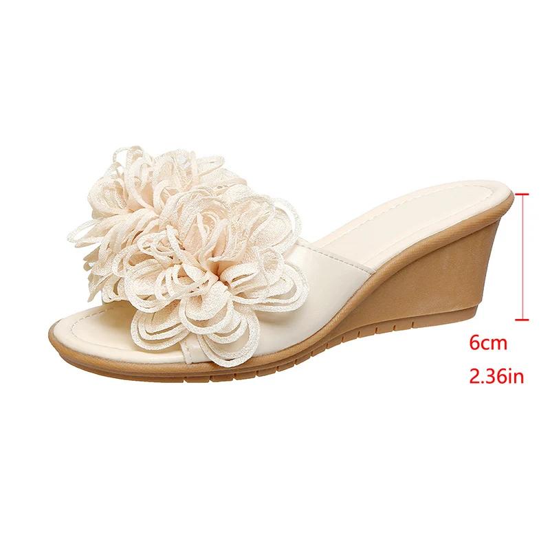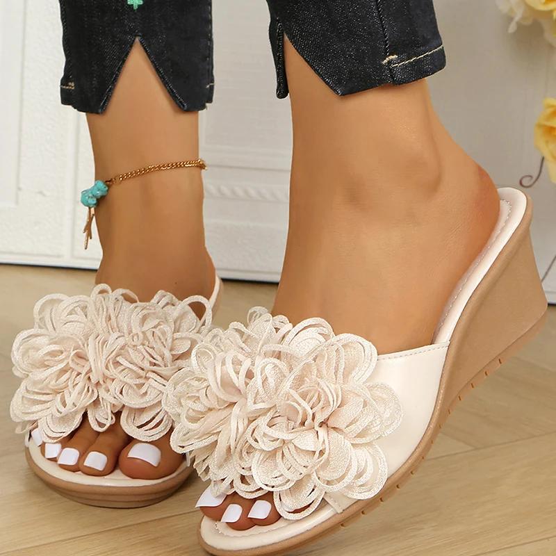 Мода 2025 Шлепанцы из искусственной кожи с большим цветком Женские Летние Нескользящие Сандалии на танкетке Женские Офисные Женские Однотонные Шлепанцы на платформе Женские