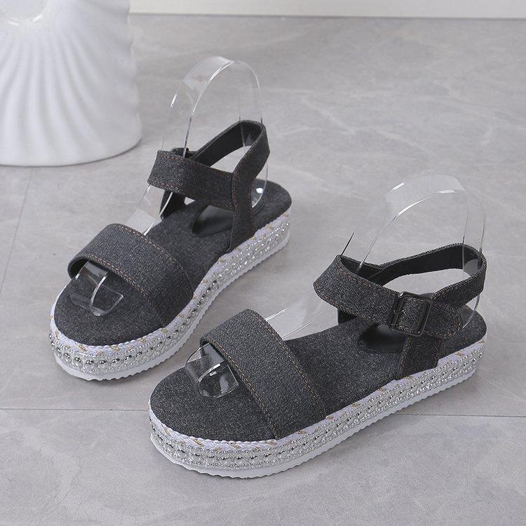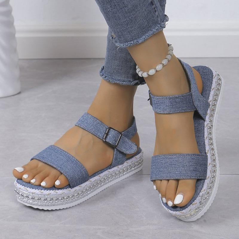 Мода 2025 Металлические Сандалии Женские Женские Летняя Мода Джинсовые Сандалии с Одной Пряжкой Открытый Носок Сандалии на Толстой Подошве