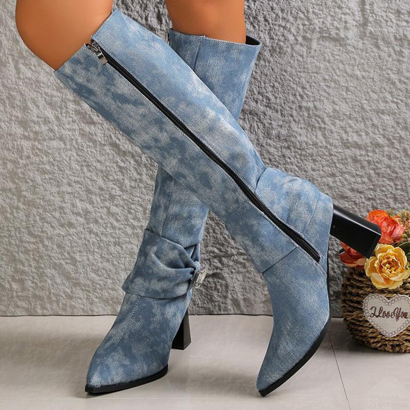 Мода Мода Супер Высокий Каблук Сапоги Женские 2025 Винтажный Острый Носок Черный Синий Сапоги До Середины Икры Женские Стразы Декор Botas Lady
