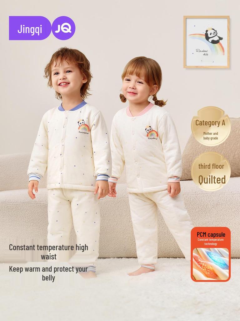 Детский пижамный комплект Jingqi из стеганого хлопка с высокой талией и защитой животика - Теплая, регулирующая температуру домашняя одежда для осени и зимы