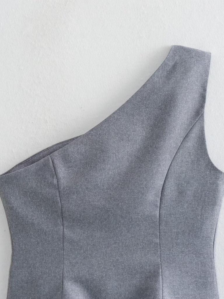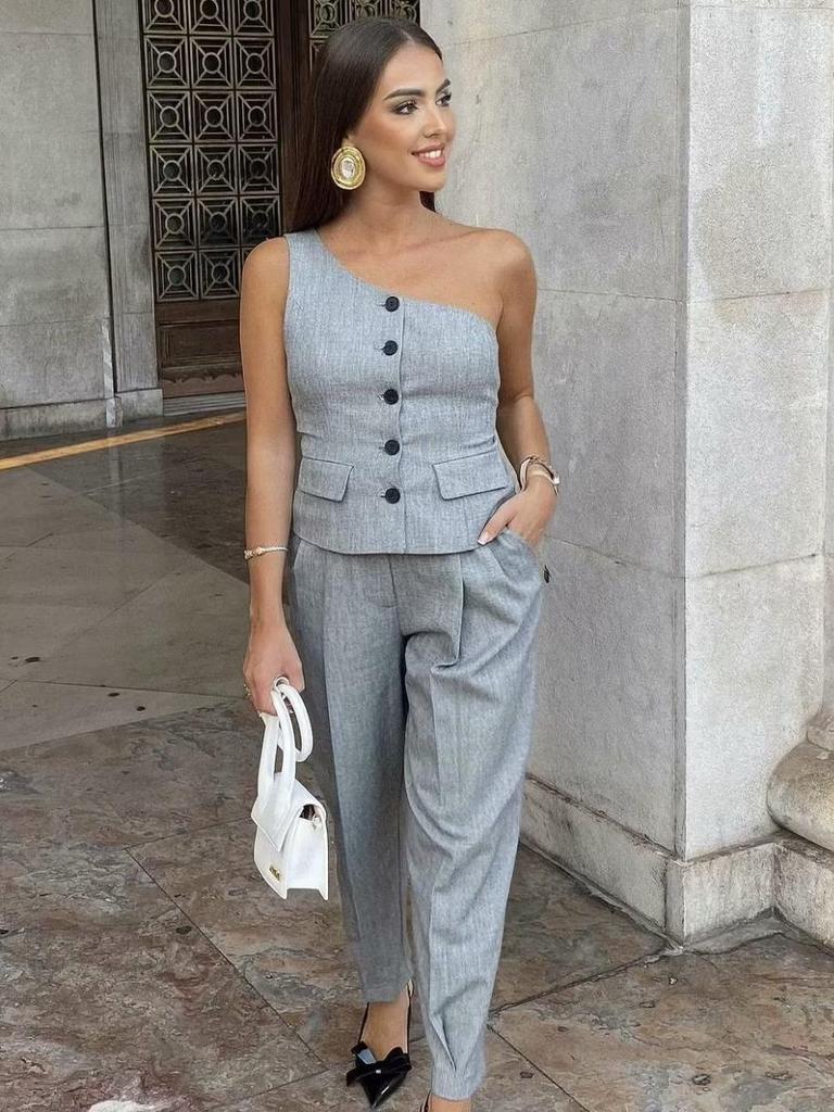 2024 Женский европейский и американский стиль асимметричный вырез жилет и брюки с высокой талией набор